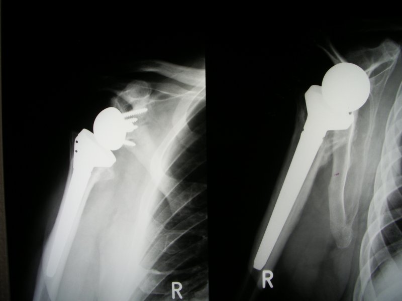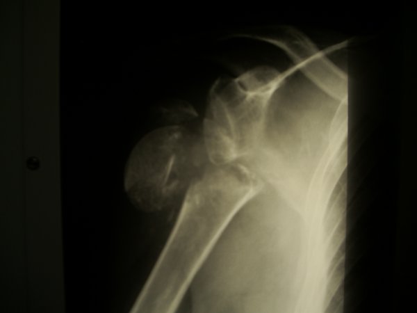 Złamanie główki kości ramiennej z całkowita destrukcja, która uniemożliwila